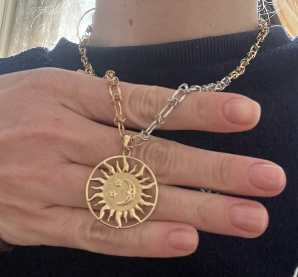Отличная подвеска. Ушко большое, но узкое. Мне его расширил ювелир за минуту, что бы ее можно было надеть на цепочку плетения муза.